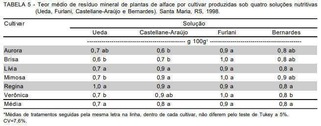Os cultivares de alface acumularam diferentes teores de resíduo mineral em função do tipo de solução nutritiva utilizada. A solução Furlani apresentou os maiores valores para os cultivares Aurora, Brisa, Mimosa e Verônica, não diferindo da solução Castellane-Araújo para os cultivares Lívia, Mimosa e Regina e, não diferindo da solução Bernardes e Ueda para os cultivares Lívia e Regina (TABELA 5).