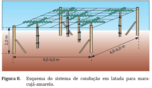 O maracujazeiro necessita de condução por ser uma planta trepadeira e de crescimento rápido. O sistema de espaldeira vertical com um fio de arame é o mais utilizado, por ser mais barato e facilitar a polinização manual e os tratos culturais e fitossanitários (Figuras 5 e 6). O fio de arame liso deve passar pelos furos dos palanques a 1,90 m do solo e ser esticado com catraca. Os palanques das cabeceiras devem ter, aproximadamente, 3,0 m de altura e 0,20 m de diâmetro e os intermediários 2,50 m de altura e 0,12 m de diâmetro, distanciados, no máximo, 12,0 m entre si. A cada 6,0 m é necessário utilizar palanques de apoio, como estacas de bambu gigante ou palanques de madeira. Tutores de bambu também podem ser utilizados como apoio e linhas muito extensas (máximo de 80,0 m) devem ser evitadas, pois dificultam o manejo das plantas e o escoamento da produção.