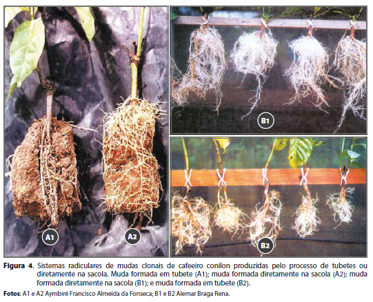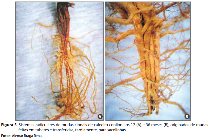 Outro fator que pode afetar a qualidade do sistema radicular do café conilon e que, no passado, constituiu-se em grandes problemas à cafeicultura capixaba, é a formação de mudas a partir de estacas (clones) mantidas por longos períodos em tubetes. Nesse caso, verificam-se raízes mal-formadas e raquíticas (Figura 4). Essas mudas quando levadas ao campo, apresentam-se com raízes enoveladas, superficiais e deformadas (Figura 5). No longo prazo, observam-se redução da absorção de água e de nutrientes e morte de plantas, principalmente em anos de carga intensa (RENA, 1998).