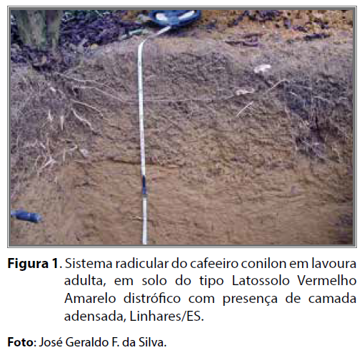 Trabalhos recentes, realizados ao longo de vários anos no Município de Vila Valério, região norte do Espírito Santo produtora de café conilon, apontaram que, apesar de a produtividade de plantas propagadas por estacas ser maior que aquelas propagadas por sementes, ambas as formas de propagação originaram sistemas radiculares semelhantes (PARTELLI et al., 2006, 2014b). Portanto, o sistema radicular do café conilon, principalmente as raízes absorventes (menores que 1,0 mm de diâmetro), avaliado por meio da área, comprimento e volume de raízes por volume de solo, seja em plantas oriundas de propagação vegetativa ou seminífera, concentra-se na camada superficial do solo: de 40% a 50% até 0,1 m e de 60% a 65% até 0,2 m de profundidade (Figuras 1 e 2), com padrão marcante de redução, à medida que se aprofunda no perfil do solo (PARTELLI et al., 2006; 2014b). Essa redução é explicada, parcialmente, pela menor concentração de alguns macronutrientes em profundidade (PARTELLI et al., 2014b). Em todo o caso, na principal região produtora de café conilon do norte do Estado do Espírito Santo, em que predomina solo do tipo Latossolo Vermelho Amarelo distrófico (LVd11), com presença de camada adensada subsuperficialmente, o sistema radicular pode concentrar-se na camada de 0-0,45 m de profundidade, apesar de uma pequena quantidade de raízes conseguir penetrar a camada adensada (SILVA et al., dados não publicados) (Figura 1).