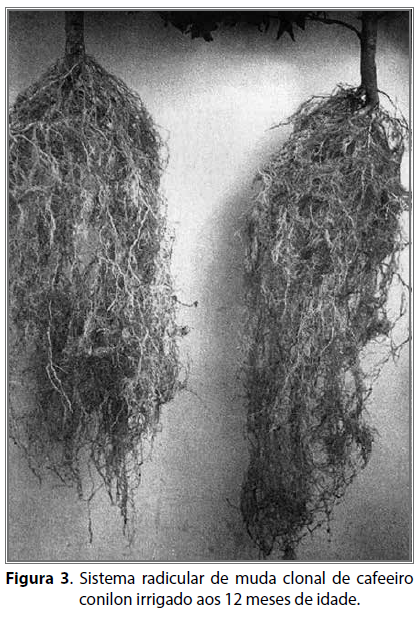 Mesmo diante do fato de que a irrigação permite a formação de mudas clonais com um sistema radicular mais vigoroso (Figura 3), é preciso considerar que a irrigação afeta o padrão de crescimento radicular, reduzindo a profundidade de penetração da raiz pseudopivotante e estimulando o desenvolvimento de raízes primárias e secundárias nas camadas mais superficiais do solo (RENA, 1998). Com efeito, em lavouras adultas de diferentes cultivares de café arábica, cultivadas sob fertirrigação no cerrado mineiro, a abundância de raízes por volume de solo é maior a 0,1 m que a 0,2 m ou 0,4 m de profundidade para vários arranjos de plantas na linha de cultivo (RONCHI et al., 2015b). Não obstante, esses mesmos autores verificaram que a redução no espaçamento, entre plantas, na linha promoveu aumento na massa de matéria seca, comprimento, volume e área superficial total de raízes por volume de solo, sem alterar o comprimento e a superfície específica de raízes e sem aprofundar o sistema radicular. Assim, os resultados obtidos em café arábica por Ronchi et al. (2015b) corroboram e sustentam os argumentos de Guarçoni M. (2011), de que o aumento na densidade de plantas em lavouras de café conilon não precisa necessariamente ser acompanhado de uma elevação proporcional na aplicação de fertilizantes por área. Isso porque a maior abundância ou distribuição quantitativa de raízes por volume de solo, em cafeeiros adensados, pode compensar um menor input de fertilizantes. Tomados em conjunto, esses resultados podem explicar, pelo menos em parte, as altas produtividades obtidas em lavouras de café conilon cultivadas em sistemas mais adensados.