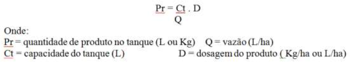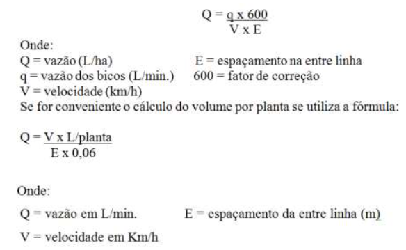 Um método muito utilizado para aregulagem e calibração desses pulverizadores é o da taxa de aplicação em litros por hectare, onde se utiliza a fórmula conforme o cálculo a seguir: