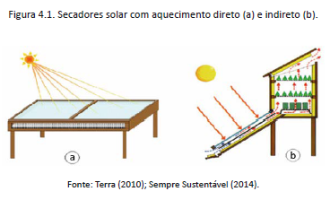 O secador solar direto é composto por uma só peça que desempenha simultaneamente a função de coletor solar e de câmara de secagem onde a radiação solar incide diretamente sobre o produto colocado no secador. O secador solar indireto é constituído por duas partes: um coletor solar que converte a radiação solar em calor e por uma câmara de secagem onde os produtos são colocados sem exposição direta à radiação solar.