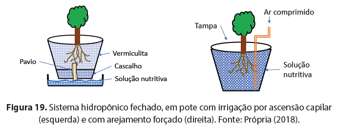 - Estáticos (Figura 19) – nesse caso, a raiz da planta fica imersa o tempo todo na solução, geralmente em potes experimentais ou em grandes piscinas de solução nutritiva, quando em uso comercial.