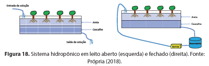 - Sistemas fechados – a solução é reutilizada, sendo descartada apenas de tempos em tempos, geralmente um ciclo da cultura. Nessa categoria se encontram a maioria dos sistemas hidropônicos atualmente utilizados (Figura 18 – direita).
