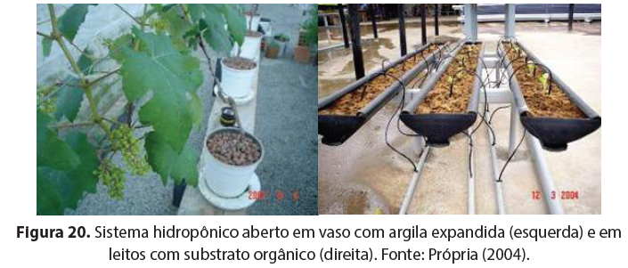 Apesar do sistema NFT ser o mais difundido, sistemas hidropônicos diversos têm sido usados em todo o país, especialmente em trabalhos de pesquisa nas Universidades e Institutos Federais. Um exemplo é o plantio de uva em vasos com argila expandida (Figura 20 – esquerda) e plantio de hortaliças em leitos com substrato orgânico com irrigação aberta (Figura 20 – direita).