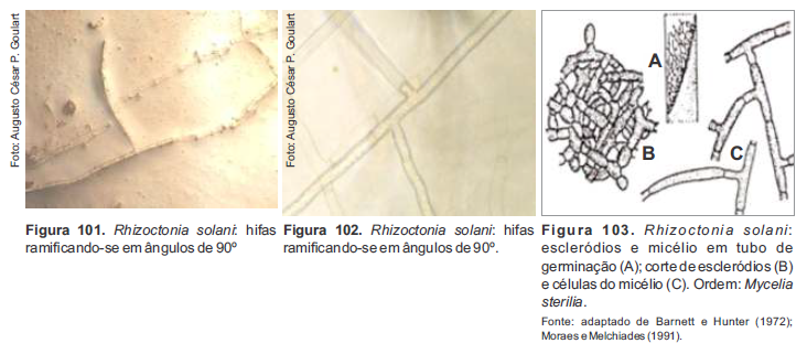 O crescimento do fungo em meio BDA é caracterizado pela presença de culturas com crescimento micelial abundante, hifas espessas, ramificadas com ângulos de 90°, característica típica do patógeno R. solani (Figuras 101, 102 e 103).