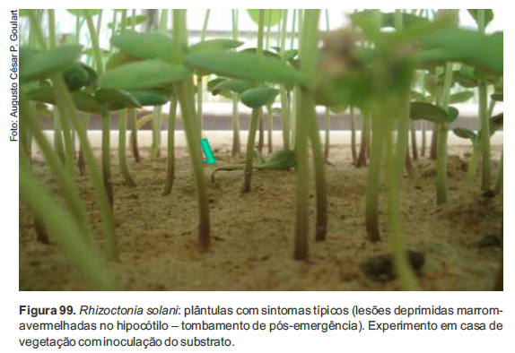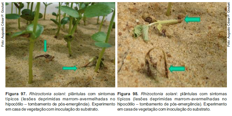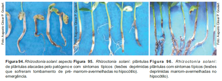 A planta atacada por R. solani desenvolve apodrecimento seco das raízes, estrangulamento do colo e lesões deprimidas e escuras (marrom-avermelhadas) no hipocótilo, abaixo e ao nível do solo (Figuras 95 e 96), resultando em murcha, tombamento ou sobrevivência temporária, com emissão de raízes adventícias acima da região afetada.