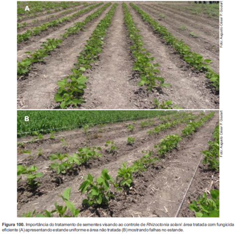 Este patógeno, estando presente no solo, além de ocasionar perdas significativas na fase de plântulas (falha no estande – Figura 100), pode servir ainda como fonte de inóculo para culturas subsequentes.