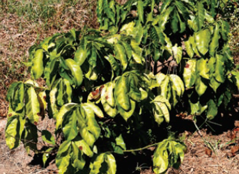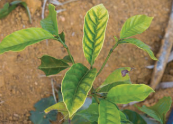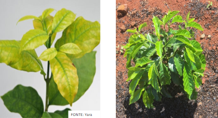 - Diagnose visual da deficiência de N: em estágios iniciais da deficiência, ocorre o amarelecimento das plantas, seguido de desfolhas e seca de ramos produtivos com a evolução da sua carência.
