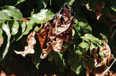 - Diagnose visual da deficiência de B: folhas novas com a superfície irregular, evoluindo para o secamento dos ramos produtivos e consequente superbrotação, com o aumento da deficiência.