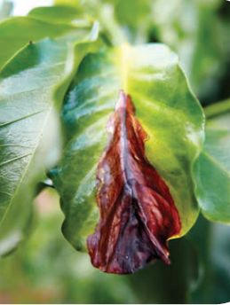 - Diagnose visual da deficiência de P: em estágios iniciais da deficiência, ocorrem manchas amareladas nas folhas, que se tornam arroxeadas, seguida pelo surgimento de necroses nas extremidades com a evolução da sua carência.