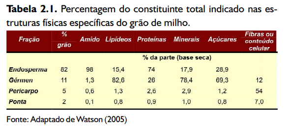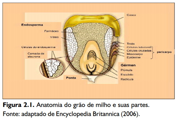 Conhecido botanicamente como uma cariopse, o grão de milho é formado por quatro principais estruturas físicas: endosperma, gérmen, pericarpo (casca) e ponta (Figura 2.1), as quais diferem em composição química e também na organização dentro do grão.