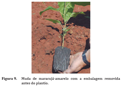 Nos meses de abril a julho, o plantio não é recomendado, pois nesse período, que coincide com o outono/inverno, a planta apresenta baixo desenvolvimento vegetativo e fica suscetível a fatores adversos como ventos frios e geadas. Antes do plantio, as mudas devem ser expostas ao sol aos poucos, para aclimatação. No momento do plantio (Figura 9), deve-se retirar a muda da embalagem e após isso, para facilitar a irrigação até garantir o pegamento das mudas, recomenda-se o coroamento das covas.