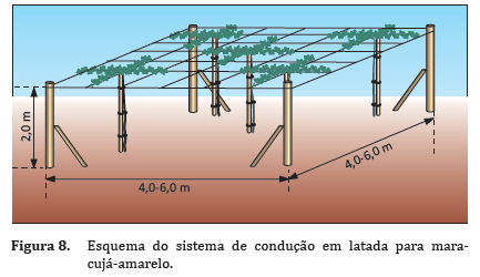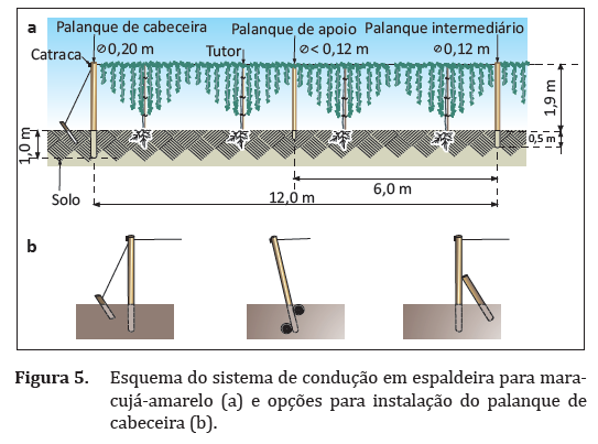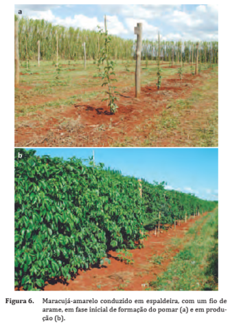 O maracujazeiro necessita de condução por ser uma planta trepadeira e de crescimento rápido. O sistema de espaldeira vertical com um fio de arame é o mais utilizado, por ser mais barato e facilitar a polinização manual e os tratos culturais e fitossanitários (Figuras 5 e 6). O fio de arame liso deve passar pelos furos dos palanques a 1,90 m do solo e ser esticado com catraca.