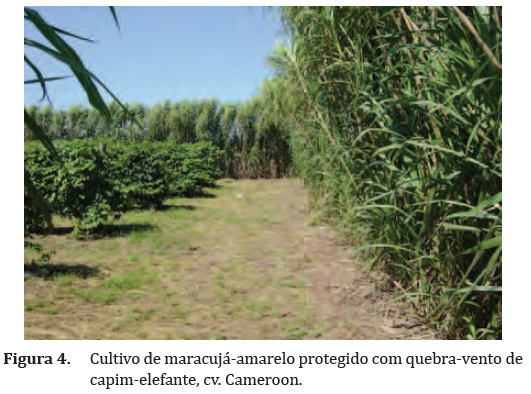 Recomenda-se a utilização de quebra-vento para minimizar a ação do vento e suas consequências, principalmente sobre a sanidade dos pomares. Não havendo disponibilidade de área com quebra-vento pré-estabelecido, sua implantação deve ser realizada com pelo menos seis meses de antecedência, de forma a oferecer proteção às mudas no momento em que forem plantadas, mantendo-se distância mínima de cinco metros da linha de plantio do maracujazeiro. O capim-elefante, cv. Cameroon (Figura 4), tem sido bastante utilizado e apresentado bons resultados.