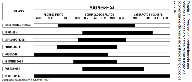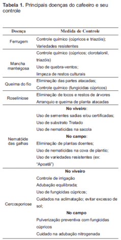 A seguir, são listadas as principais doenças do cafeeiro e as formas mais comuns de controle (Tabela 1), bem como as épocas mais comuns de ocorrência das doenças (Tabela 2).