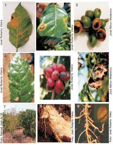 Para se obter o máximo de eficiência de controle é necessária uma diagnose precisa das doenças. Nas figuras abaixo são apresentados os sintomas das principais doenças do cafeeiro e onde ocorrem preferencialmente.