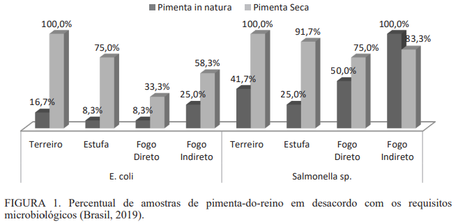 Constatou-se que 68,7% da pimenta seca analisada apresentavam-se em desacordo com o padrão estabelecido para E. coli. Salmonella sp. foi constatada em 42,5% (17/40) das amostras de pimenta in natura em contagens que variaram entre 8,00x100 a 8,20x102 UFC/g. Na pimenta seca, o patógeno foi isolado em 87,5% das amostras, com contaminações variaram entre 2,3x101 e 4,10x103 UFC/g. Apenas 12,5% das amostras de pimenta seca estavam em conformidade com a legislação vigente, ou seja, apresentaram ausência de Salmonella em 25g do produto.