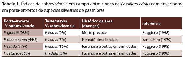 A Tabela 1 mostrou as taxas de sobrevivência de cultivos em região de solo com alto índice fitopatógenos de clones de Passiflora edulis enxertados em cavalos de maracujás silvestres comparados aos de P. edulis propagadas por sementes, acompanhadas durante 2 anos e meio.
