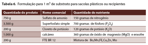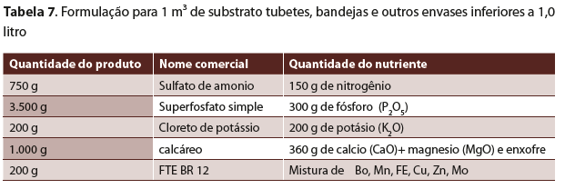 A fim de garantir um perfeito desenvolvimento das mudas e sucesso das futuras colheitas devido às perdas de chorume, fazemos as recomendações de Yamazoe, G. que são seguidas nas tabelas 6 e 7.