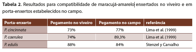 A Tabela 2 mostra o resultado da pesquisa de alguns autores em relação a compatibilidade de porta-enxerto de maracujás silvestres e azedo enxertados no viveiro e no campo com o maracujá-amarelo.
