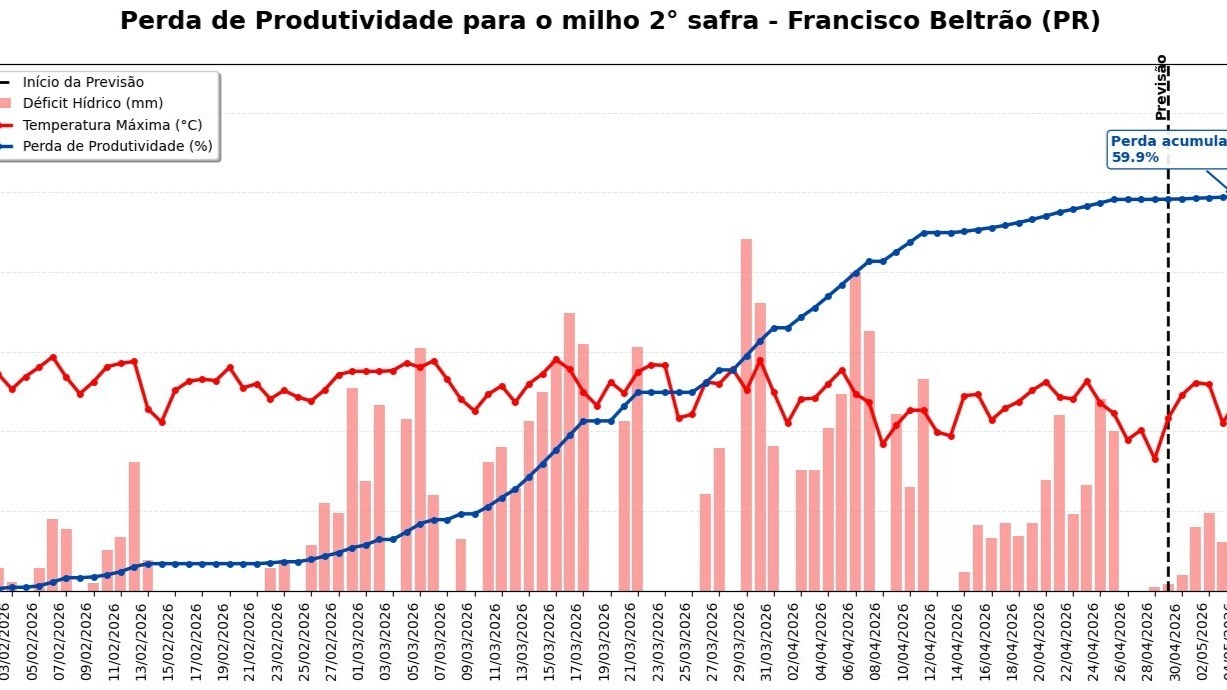 No sudoeste paranaense, uma das regiões mais afetadas, a situação preocupa. Dados do sistema SISDAGRO apontam déficit hídrico persistente desde o fim de fevereiro em áreas como Francisco Beltrão. A irregularidade das chuvas ao longo do ciclo não foi suficiente para recuperar a umidade do solo.