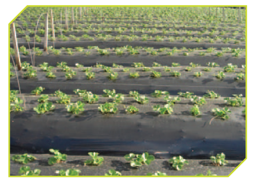 Plantio a campo aberto em canteiros com utilização de cobertura de plástico (“mulching”) com o uso do sistema de irrigação por Irrigação ou gotejamento realizado com o mesmo espaçamento do sistema de plantio anterior. Utiliza-se plástico apropriado com 1,6 m de largura e 500 m de comprimento. Apresentam vantagens competitivas tais como: menor gasto de água e energia durante a irrigação, a não necessidade de capinar que propicia menor gasto com mão-de-obra, colheita mais precoce e, portanto, a produção chega antes no mercado e há maiores ganhos de produtividade. No período seco existe a inconveniência das plantas se desidratarem mais facilmente, após a colheita. O mulching pode ser utilizado até quatro plantios.