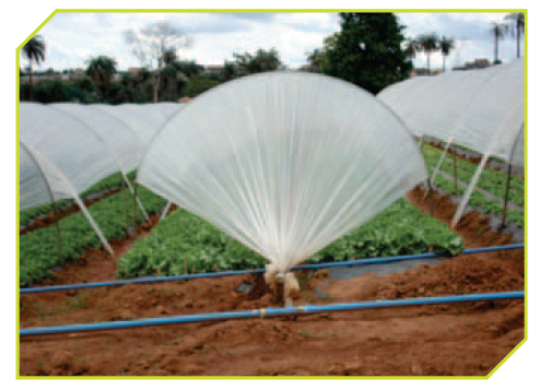 Plantio em Túnel Baixo - Utilizam-se arcos de aço galvanizado de uma polegada colocada sobre os canteiros, sendo que a distância entre os arcos fica em torno de 3,50 m e entre os pés dos arcos 3,20 m, com altura final 1,80 m e em seguida é colocado o filme plástico (longa vida de 75 micra e com 4,0 m de largura), que é esticado sobre os mesmos e fixado nas extremidades do túnel em peças de madeira enterrado no solo. Também, são colocados sobre o filme plástico nos intervalos dos arcos, cintas de filme plástico de 200 micra de espessura por 20 cm de largura para fixação do túnel que são fixadas no solo. A dimensão do túnel padrão é de 3,20 m de largura por 50 m de comprimento. Abrange dois, canteiros, comportando cerca de 1200 pés de alface. Apresentam como vantagens competitivas: plantio adequado para uso na época das águas, para proteger as plantas do excesso de chuvas, colheita na entressafra, obtendo produção em épocas de melhores preços; precocidade da colheita; amplia o período de safra; melhor qualidade do produto, principalmente na pós-colheita, menores gastos com agrotóxicos, adubos e mão de obra e aumento da produtividade.