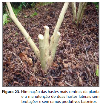 Na ocasião da realização da primeira etapa da PPC, após a realização da terceira, quarta ou mesmo da quinta colheita, conforme tenha sido programado, devem ser eliminadas todas as hastes mais centrais de cada planta a uma altura entre 20 e 30 cm do solo (VERDIN FILHO, 2008). Devem permanecer na planta, no máximo, duas hastes mais externas e sempre voltadas para as entrelinhas de plantio conferindo à planta o formato de “V”, uma conformação que facilita a penetração de luz, promove a formação de novos brotos e o seu desenvolvimento vigoroso, com alto potencial produtivo. Para tanto, as hastes remanescentes podem ter todos os seus ramos plagiotrópicos baixeiros eliminados para que não prejudiquem a formação das novas brotações ortotrópicas (Figura 23).