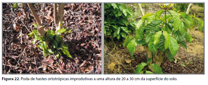 A poda é operacionalizada ao se realizar o corte da haste ortotrópica à altura de 20 a 30 cm da superfície do solo (Figura 22) ou logo acima do broto de espera eliminando-se ramos ladrões, estiolados, velhos ou improdutivos e o excesso de brotações localizadas no interior da planta. Quando esse sistema de poda é iniciado precocemente, evitam-se perdas por estiolamento dos ramos mais baixos e pode-se dar início ao trabalho de conformação adequada das plantas de acordo com o arranjo adotado e o espaçamento escolhido.