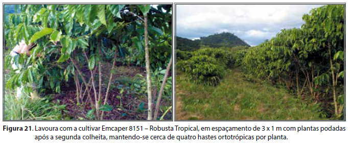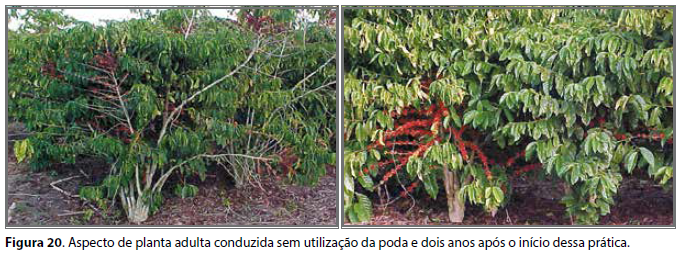 Como até então as lavouras eram conduzidas sem adoção rotineira e ordenada de quaisquer sistemas de podas, a grande maioria delas era constituída de plantas que apresentavam excesso de hastes ortotrópicas. Assim, o sistema foi inicialmente recomendado para lavouras adultas visando à recuperação da sua capacidade produtiva (Figura 20), sendo, contudo, também recomendado para lavouras mais jovens (Figura 21).