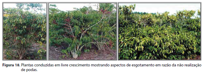 Até o início da década de 90, as lavouras de café conilon eram conduzidas sem a utilização de qualquer forma de poda (SILVEIRA, 1996). Lavouras conduzidas em livre crescimento apresentam curva de produção alcançando valores máximos entre a terceira e quinta colheitas, declinando a partir daí (SILVEIRA, 1995). O conilon é uma planta de crescimento contínuo, apresentando o desenvolvimento de vários ramos verticais, denominados ortotrópicos, e horizontais, os produtivos, que são os plagiotrópicos (CANNELL, 1985).