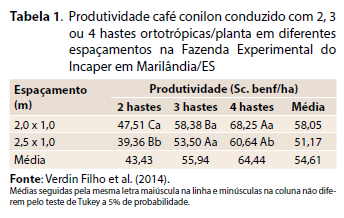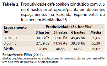 Verdin Filho et al. (2014), utilizando espaçamentos de 3,0 x 1,0 m e 3,0 x 1,5 m, também em trabalhos conduzidos sem irrigação, mas com a PPC, com três, cinco e seis hastes por planta, obtiveram produtividades de 30,38; 39,10 e 49,45 sc. benef./ha, respectivamente, para três, cinco ou seis hastes por planta espaçadas de 3,0 x 1,0 m. Utilizando-se do espaçamento de 3,0 x 1,5 m, a produtividade foi de 27,39; 41,98 e 39,78 sc. benef./ha para três, cinco ou seis hastes, respectivamente (Tabela 2). Esses resultados indicam a possibilidade de obtenção de respostas positivas na produtividade do café conilon com redução dos espaçamentos indicados anteriormente, quando associado ao aumento do número de hastes por planta.