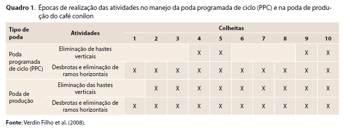 Para efeito comparativo, são apresentados no Quadro 1 os cronogramas de atividades para quando da utilização das duas formas de condução do café conilon, segundo Verdin Filho et al. (2008).