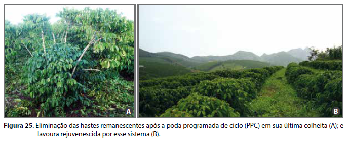 A PPC pode também ser empregada em lavouras mais antigas, antes não conduzidas nesse sistema. Assim sendo, faz-se necessária a eliminação de todas as hastes em excesso nas plantas mantendo-se somente aquelas recomendadas para cada situação. Não é apropriada a eliminação de todos as hastes (recepa), pois, em trabalhos realizados comparando a recuperação de lavouras de café conilon com o uso da recepa com outros tipos de poda, verificou-se ganhos superiores na produção ao longo dos anos com o uso da PPC, além de outros benefícios já citados (VERDIN FILHO et al., 2012a; 2013b).