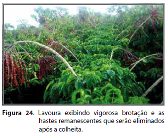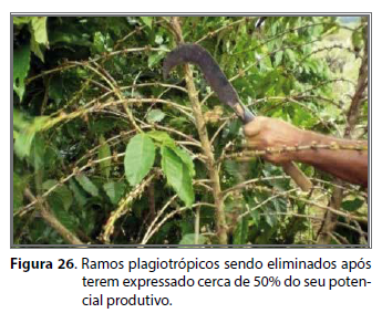 A poda de produção inclui seguidas desbrotas. Constitui-se num sistema em que as lavouras, com mais de três a quatro safras, conduzidas sem qualquer interferência anterior, têm suas hastes ortotrópicas mais velhas e improdutivas eliminadas paulatinamente e substituídas por novas, que originam-se de brotações vigorosas, selecionadas na base daquelas que foram retiradas (Figura 19). Os brotos mais centrais e aqueles que se encontravam mal localizados, impedindo a penetração de luz no interior das plantas, devem ser eliminados, permanecendo somente os que irão recompor as plantas (SILVEIRA et al., 1993; SILVEIRA; ROCHA, 1995).