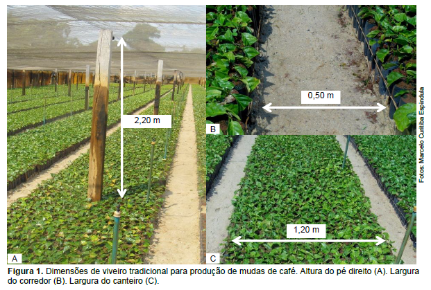 O viveiro deve ter altura mínima de pé direito de 2,20 m. Os canteiros devem possuir 1,20 m a 1,40 m de largura para facilitar os tratos culturais e o manejo das mudas. O comprimento dos canteiros dependerá da infraestrutura e demanda de mudas, normalmente entre 20 m a 30 m de comprimento, e os corredores devem apresentar de 0,50 m a 0,60 m de largura (Figura 1).