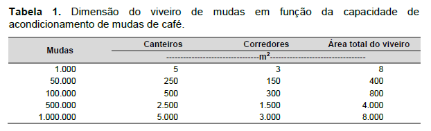 A área do viveiro será proporcional ao total de mudas de café a serem produzidas e do tamanho da sacola a ser utilizada. Estima-se que 1,0 m2 de canteiro possa acomodar de 196 a 256 sacolas de polietileno de dimensões 11 cm x 20 cm x 0,006 cm (MARCOLAN et al., 2009).