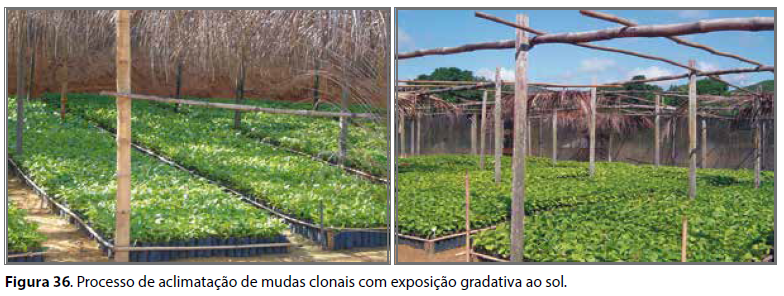 Quando se usa a cobertura do viveiro com sombrite, a aclimatação pode ser feita pela exposição progressiva das mudas ao sol através da retirada gradual da cobertura do viveiro evitando o deslocamento das mudas (Figura 36).
