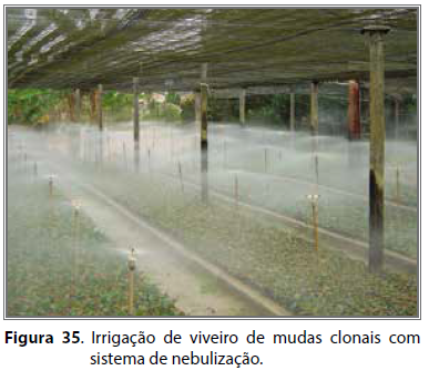 Os viveiros de mudas clonais devem ser irrigados preferencialmente pelo método de microaspersão por nebulização (Figura 35). Devem ser munidos com dispositivos de temporização, para tornar o processo automatizado, com irrigações intermitentes. Esses dispositivos ativam o sistema de irrigação a cada período determinado de tempo ou conforme a umidade relativa no ambiente. Os temporizadores podem ser adquiridos no comércio especializado ou construídos na propriedade com materiais variados, dependendo da criatividade do cafeicultor.