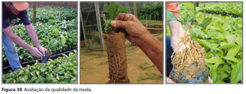 Antes da retirada das mudas para o plantio definitivo, os diferentes lotes devem passar por um processo de avaliação visando a disponibilizar aos produtores apenas as mudas de melhor qualidade. As características consideradas nessa etapa são as seguintes: idade, altura, coloração das folhas, sintomas de incidência de pragas e doenças, quantidade e distribuição do sistema radicular, consistência do substrato, entre outras (Figura 38).