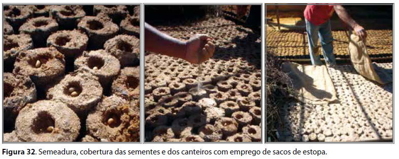 Para a produção de mudas de café a partir de sementes de modo a evitar o comprometimento no desenvolvimento do sistema radicular, recomenda-se que a semeadura seja feita diretamente nos recipientes. Efetua-se a semeadura de duas sementes por sacola, próximas uma da outra, diretamente nos recipientes, a uma profundidade de 1,0 cm. Em seguida, as sementes são cobertas com uma camada fina de areia, e os recipientes com sacos de estopa visando a evitar que a água de irrigação ou mesmo das chuvas as descubra, além de conservar a umidade e diminuir o aparecimento de ervas daninhas (Figura 32).
