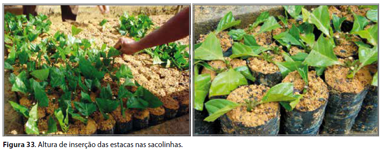 As estacas já preparadas e prontas para o plantio são, então, conduzidas ao viveiro, devendo ser plantadas o quanto antes. Devem ser introduzidas no substrato, previamente preparado, até a altura da inserção das folhas (Figura 33). Visando a reduzir as operações necessárias ao replantio de estacas perdidas, pode-se manter, entre as mudas de um mesmo clone, estacas suspensas nos espaços entre os recipientes, de modo a evitar o retorno aos jardins clonais para novas coletas de pequenas quantidades de estacas.