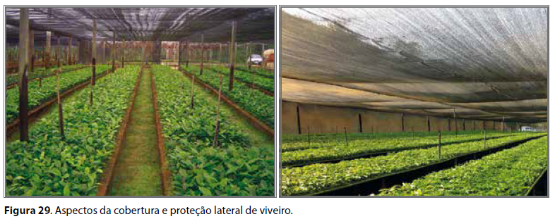 Para a produção de mudas de variedades propagadas por sementes, o viveiro pode ser construído com materiais mais rústicos, disponíveis na propriedade, como ripas de madeira ou bambu; podem ser cobertos com materiais como folhas de palmeiras, capim-elefante ou outro qualquer que proporcione efeito semelhante.