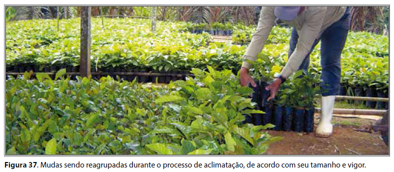 Durante a aclimatação, é recomendável que as adubações sejam suspensas, ou minimizadas, para que haja o estímulo do crescimento do sistema radicular, pois, após o plantio definitivo, haverá maior dificuldade de sobrevivência daquelas mudas mais dependentes da pronta disponibilidade de água e nutrientes. A disposição das mudas nos canteiros de aclimatação deve ser feita levando-se também em consideração o seu tamanho, ou seja, as mais desenvolvidas devem ser reagrupadas separadamente das menos desenvolvidas, de forma a não retardar ainda mais o crescimento dessas últimas (Figura 37).