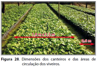 Os viveiros devem ser construídos com cobertura voltada para o sentido norte-sul, seguindo as especificações técnicas. Os canteiros devem possuir de 1,0 a 1,2 m de largura e comprimento variável, separados por corredores de 0,6 m de largura (Figura 28), para facilitar a passagem das pessoas, os tratos culturais e o transporte das mudas. As vias externas devem possuir largura compatível com a movimentação dos veículos utilizados (De MUNER et al., 2000).