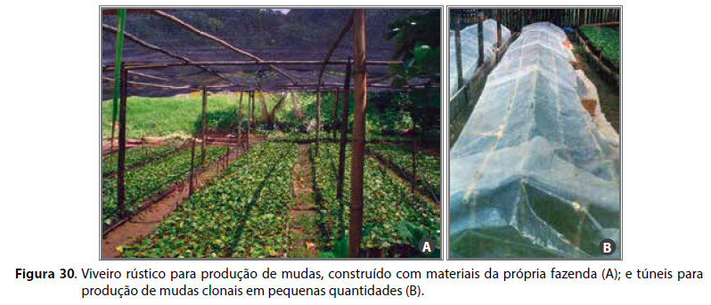 Apesar dos cuidados requeridos, a produção de mudas clonais também pode ser realizada pelos próprios cafeicultores, mesmo em pequenas propriedades, utilizando-se estruturas mais rústicas e de baixo custo. Nesses casos, conforme descrito por Silveira e Fonseca (1995), podem-se utilizar viveiros convencionais, com as estacas plantadas sob coberturas ou túneis de material plástico transparente, dispostos no interior do viveiro, dentro dos quais são mantidos recipientes com água para favorecer a manutenção de alta umidade relativa do ar (Figura 30).