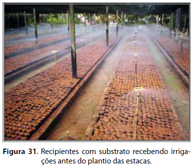 Para a produção de mudas clonais, os recipientes contendo o substrato anteriormente descrito devem permanecer em repouso por um período não inferior a 30 dias, antes do plantio das estacas, dispostas nos canteiros definitivos dos viveiros, recebendo irrigações constantes (Figura 31). O plantio em substrato recém-preparado causa expressivo decréscimo no índice de pegamento (SILVEIRA; FONSECA, 1995).