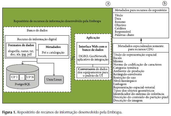 No Brasil, a Rede de Agricultura de Precisão da Embrapa - Rede AP - atenta à necessidade de adoção de padrões para armazenamento e intercâmbio de dados e informações, e de uma arquitetura orientada a serviços que permita a interoperabilidade entre sistemas, mantendo a memória, a preservação, a recuperação e o intercâmbio com qualidade dos dados produzidos pelas unidades pilotos, desenvolveu um repositório de recursos de informação (https://www.redeap.cnptia.embrapa.br) que usa o perfil de metadados ‘Perfil de Metadados Geoespaciais do Brasil’ - versão homologada em 2009 pelo Comitê de Planejamento da Infraestrutura Nacional de Dados Espaciais (CONCAR) - para catalogar os dados geoespaciais e com arquitetura que permite a integração e interoperabilidade de aplicações. Na Figura 1a, é mostrada a estrutura banco de dados e sua integração com a camada de aplicação. Os recursos de informação digitais suporta os formatos - shapefile, raster, txt, doc,xls, jpg e pdf - e estão associados a elementos de metadados. Já a camada de aplicação é composta pela integração de ferramentas de softwares livre - banco de dados PostgreSQL, WebGIS i3Geo e o aplicativo para catalogação de dados geoespaciais GeoNetwork - e de conversores de dados dos equipamentos de sensoriamento usados pela Rede AP, com a função de realizar a interface com os usuários. Na Figura 1b, são ilustrados os elementos de metadados selecionados, customizados, criados e em uso, para a catalogação de dados geográficos e não geográficos (somente tabulares). Nesse diagrama, os elementos de metadados foram agrupados numa generalização e especialização. A generalização do diagrama representa os elementos de metadados que devem ser preenchidos, independente do tipo de dado ser tabular ou geográfico (CDG). Já a especialização expressa os elementos de metadados que devam ser preenchidos somente para o tipo CDG. Vale ressaltar que dois novos elementos foram criados dentro da Seção Identificação do ‘Perfil de Metadados Geoespaciais do Brasil’: “Observação” para contemplar qualquer observação ou necessidade de documentação que por ventura não possa ser expressa pelos demais elementos de metadados selecionados; e “Responsável pela Catalogação” para identificar o autor de documentação dos metadados. Com relação ao elemento “Observação”, a ideia é analisar a frequência de necessidade de uso desse descritor para, posteriormente, eleger ou criar novas seções ou elementos para atender as especificidades de documentação do projeto AP (QUEIROS et al., 2011). O grande avanço conseguido pelo projeto é permitir a obtenção de séries históricas espaciais e temporais de lavouras, sendo elemento chave não só para alimentar as novas necessidades de pesquisa, mas também para rastreabilidade e comparação entre sistemas que adotaram a AP. Considerando que o repositório da Rede AP e seus resultados permitiram o estabelecimento de padrões adequados para operacionalizar, armazenar, recuperar, intercambiar e interoperar os dados e informações obtidas nas unidades pilotos, de forma quantitativa e qualitativa, ele permitirá também que essa experiência seja extrapolada para o manejo de propriedades agrícolas. Esse repositório foi concebido para atender necessidades futuras de organização e tratamento de informação.